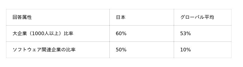 本調査における日本サンプルは、他国と比較して大企業およびソフトウェア関連企業の比率が高い構成となっています。