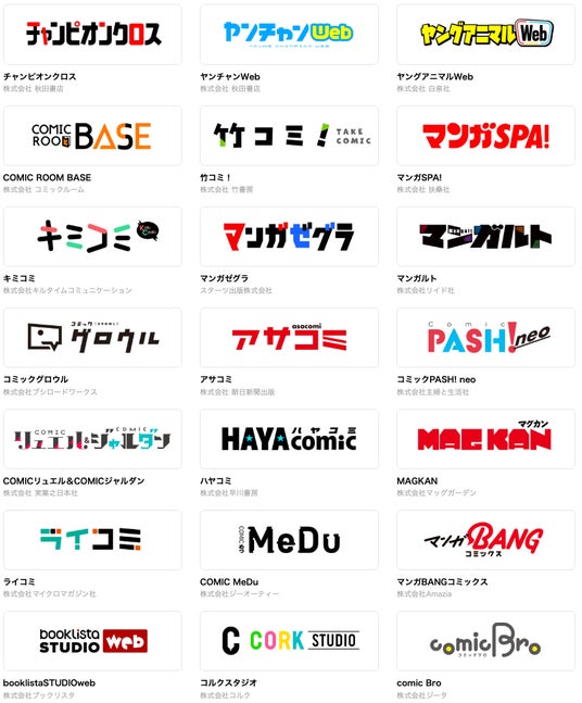 「チャンピオンクロス」「ヤンチャンWeb」(株式会社 秋田書店) / 「ヤングアニマルWeb」(株式会社 白泉社) / 「マンガゼグラ」(スターツ出版株式会社) / 「マンガルト -Mangalt-」(株式会社リイド社) / 「ハヤコミ」(株式会社 早川書房) / 「COMIC MeDu」(株式会社 ジーオーティー) / 「コミックPASH! neo」(株式会社 主婦と生活社) / 「コミックグロウル」(株式会社ブシロードワークス) / 「アサコミ」(株式会社 朝日新聞出版) / 「マンガSPA!」(株式会社 扶桑社) / 「COMICリュエル&COMICジャルダン」(株式会社 実業之日本社)/ 「竹コミ!」(株式会社 竹書房) / 「ライコミ」(株式会社 マイクロマガジン社) / 「キミコミ」(株式会社 キルタイムコミュニケーション) / 「MAGKAN」(株式会社 マッグガーデン) / 「マンガBANGコミックス」(株式会社Amazia) / 「booklistaSTUDIOweb」(株式会社 ブックリスタ) / 「コルクスタジオ」(株式会社 コルク)