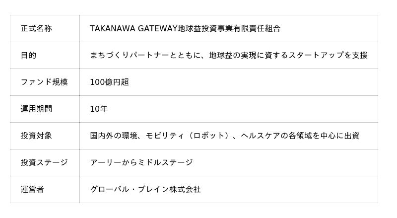日鉄興和不動産株式会社(本社︓東京都港区、代表取締役社長︓三輪 正浩、以下「当社」)は、TAKANAWA GATEWAY CITYにおける広域スタートアップエコシステム構築の推進に向け、2024年12月に東日本旅客鉄道株式会社(以下「JR東日本」)がグローバル・ブレイン株式会社と共同で設立した「TAKANAWA GATEWAY 地球益投資事業有限責任組合(以下「高輪地球益ファンド」)」に、まちづくりパートナーとして出資いたしましたので、お知らせいたします。