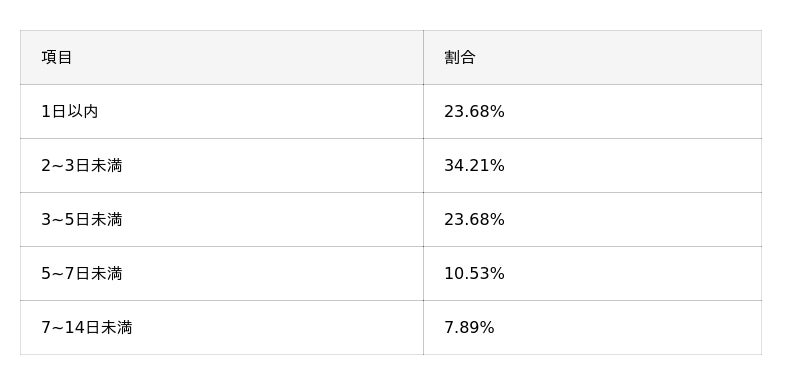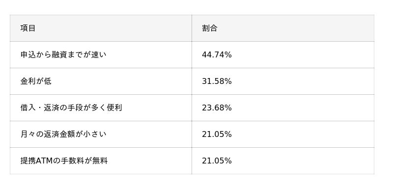 - 約45%の人が「融資までが速い」点をメリットに挙げている。実際、半数以上が3日未満で借り入れを完了しており、スピード感のある対応が満足度に繋がっていることが分かる。