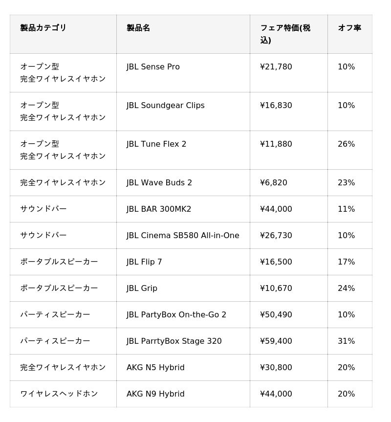 アメリカ カリフォルニア発祥の世界最大級のオーディオブランド「JBL」を擁するハーマンインターナショナル株式会社(本社:東京都千代田区、代表取締役:桑原拓磨)は、2026年3月3日(火)~3月25日(水)の期間限定で人気のワイヤレスイヤホンやポータブルスピーカー、サウンドバーを最大31%オフで購入できる「春の新生活応援フェア2026」を開催いたします。