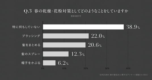 春の髪トラブルの対策については、「何もしていない」と回答した人が最多38.9%で、春の髪の悩みを感じながらも、適切なケアができていないことが明らかになりました。