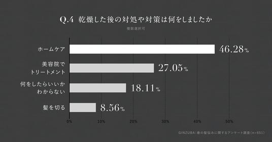 「乾燥後の対処や対策は何をしましたか」という質問に対し、最も多かったのは「ホームケア」で46.28%となりました。その他には、「美容室でトリートメント」(27.05%)や「髪を切る」(8.56%)といった、美容室でお金をかけてケアを選ぶ方もいることが分かりました。また、「何をしたら良いかわからない」と回答した方も20%近く存在することが分かりました。