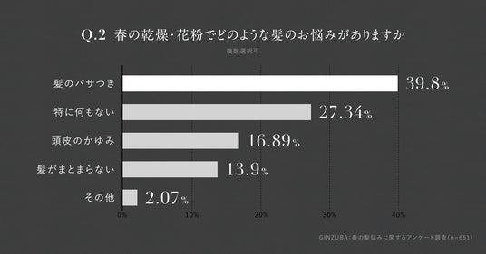 「春の乾燥・花粉で、どのような髪のお悩みがありますか」という質問に対し、最も多かった回答は、「髪のパサつき」で39.8%となりました。その他には、「頭皮のかゆみ」(16.89%)や「髪がまとまらない」(13.9%)など、頭皮トラブルに関する悩みもありました。