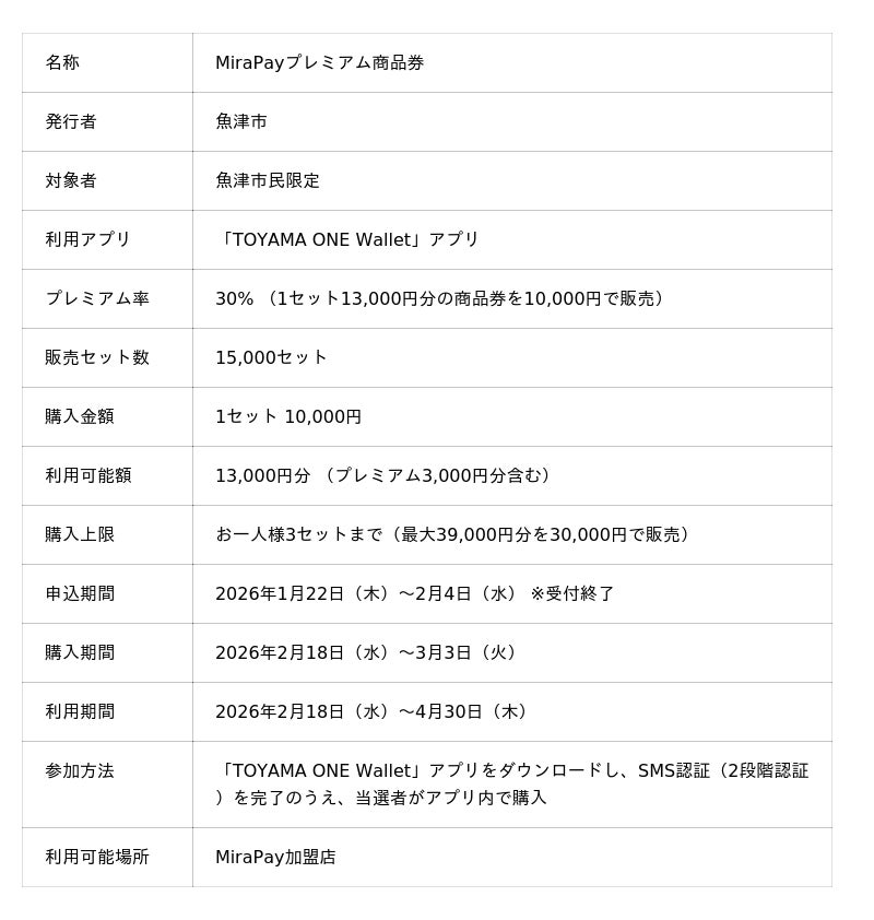 フェリカポケットマーケティング株式会社(東京都文京区、代表取締役:納村哲二、以下当社)は、富山県魚津市が国の重点支援地方交付金を活用して実施する「MiraPayプレミアム商品券」について、2026年2月18日(水)より、市民を対象とした商品券の購入および利用を開始しましたので、お知らせいたします。