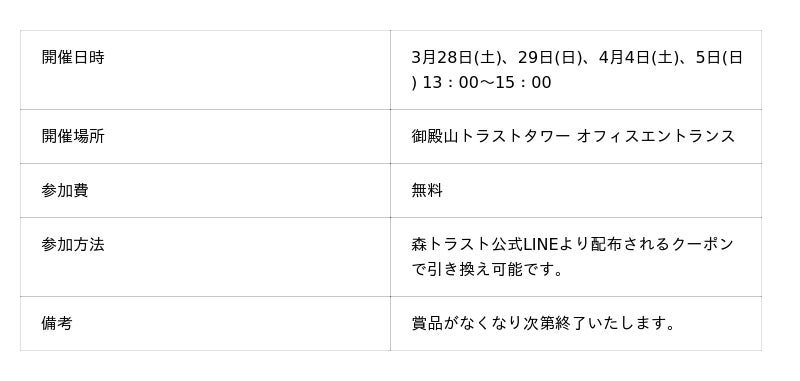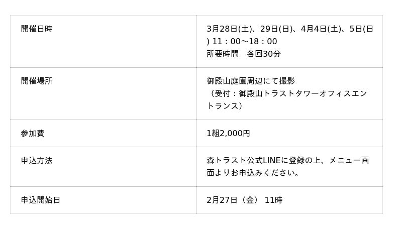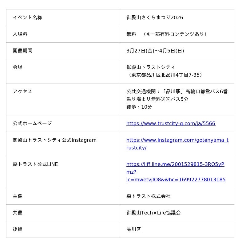 森トラスト株式会社は、3月27日(金)から4月5日(日)まで、品川駅徒歩10分に位置する御殿山(ごてんやま)トラストシティにて、「御殿山さくらまつり2026」を開催いたします。