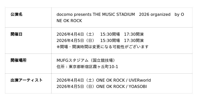 株式会社NTTドコモ(以下、ドコモ)は、2026年4月4日(土)と2026年4月5日(日)にMUFGスタジアム(国立競技場)で開催する「docomo presents THE MUSIC STADIUM 2026 organized by ONE OK ROCK」(以下、本イベント)のオフィシャルグッズを2026年2月27日(金)から事前販売開始します。