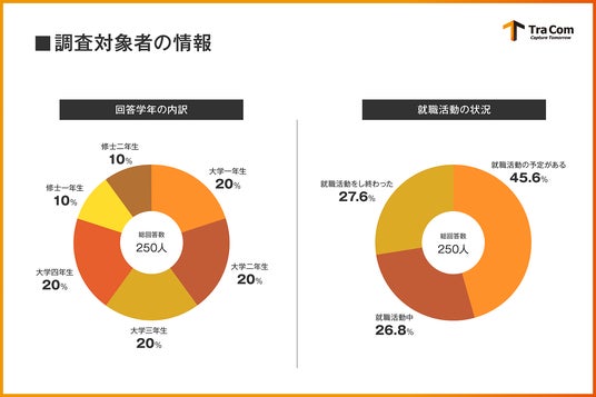 回答学年の内訳は、大学一年生~四年生が各20%、修士一年生・二年生がそれぞれ10%となっています。就職活動の状況としては、「就職活動の予定がある(45.6%)」、「就職活動中(26.8%)」、「就職活動をし終わった(27.6%)」となりました。※サンプル数=250