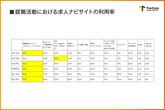 どの学年でも就職情報ナビサイトの利用が多い中で、特に大学三年生(72.0%)や修士二年生(76.0%)の利用率が高く、就職活動が本格化する時期において重要な情報収集手段となっていることがわかります。