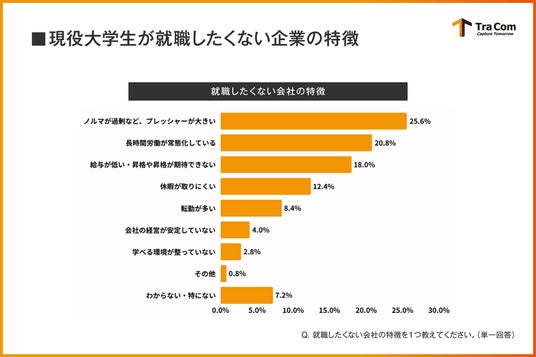 次に、現役大学生が就職したくない企業の特徴では、「ノルマが過剰など、プレッシャーが大きい(25.6%)」が最も多く、「長時間労働が常態化している(20.8%)」、「給与が低い・昇格や昇給が期待できない(18.0%)」が続きました。こちらの結果では、1.現役大学生が魅力を感じる企業の特徴で上位にあがった特徴と逆の特徴が選ばれる傾向となりました。