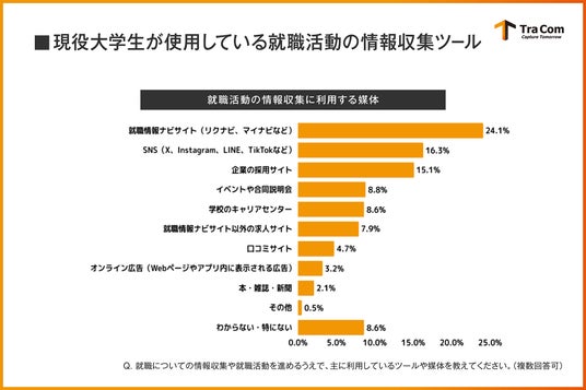 就職活動の情報収集では、「就職情報ナビサイト(24.1%)」が最多で、次いで「SNS(16.3%)」が続き、オンラインでの情報収集が主流となっています。3位は「企業の採用サイト(15.1%)」で、企業のビジョンや社風など、企業独自の情報を直接提供収集できる手段として一定の利用が見られました。