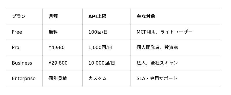 Webでの企業情報閲覧は登録不要、全機能無料です。課金対象はAPI/MCPの利用のみ。Free(100回/日)でも、AIチャット経由(MCP)なら1日約30回程度のAI分析が可能です。