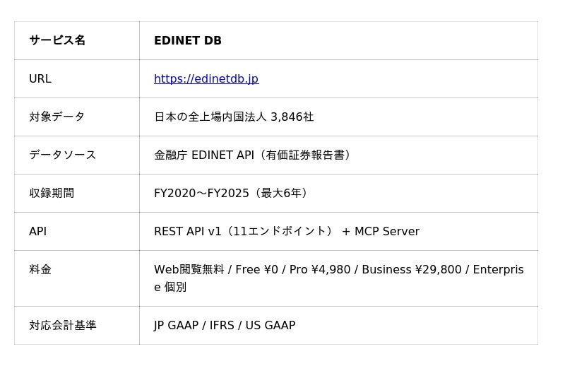 ChatGPTやClaude.aiなどのブラウザAIから直接接続できる、名寄せ済み日本株財務データサービスとしては日本初です(当社調べ、2026年2月28日時点)。類似サービスのMCP対応はローカル実行型(ユーザー側でサーバー構築が必要)に留まっており、ブラウザAIからの直接接続に対応しているのはEDINET DBのみと認識しています。