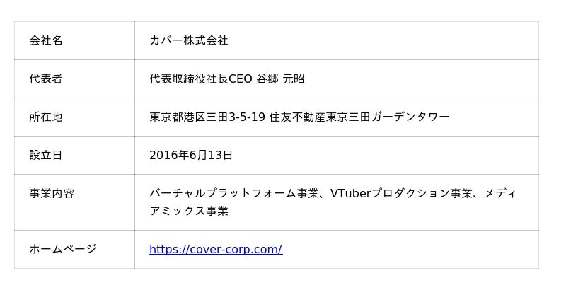 カバー株式会社は、インターネットを活用したIPビジネスを手がけ、世界屈指のVTuberIPと熱量の高いファンコミュニティを擁する次世代のITエンターテインメント企業です。 「つくろう。世界が愛するカルチャーを。」をミッションに掲げ、VTuber事業を始めとした日本発のグローバルに広がる二次元エンターテイメントを展開しているほか、新たなコミュニケーション手段としてのプラットフォームやメタバースの開発など、コンテンツ×テクノロジーを駆使し、世界が愛するバーチャルカルチャーを生み出すことを目指しています。