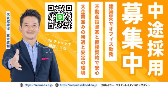 福岡市に本社を構え、日本全国の不動産投資家と直接契約して新築アパート一棟投資や老人ホーム投資などをサポートする建築会社、株式会社セイコー・エステート&ディベロップメント(所在地:福岡市中央区、代表取締役:高木政利)は、福岡で新築アパートや老人ホームの建築施工管理・現場監督・建築設計士の中途採用を本格化するため、採用特化サイトを公開しました。福岡の建築業界では施工管理人材の不足が続いており、即戦力となる施工管理経験者の採用が課題となっています。同社はYouTube(100億企業に挑戦中)およびTikTok(100億企業に挑戦中)で1年間にわたり100本以上の動画を公開。福岡の建設会社としての建設DXの取り組みや施工管理の働き方を発信し、福岡で転職を検討している建築技術者に向けて採用活動を強化しています。