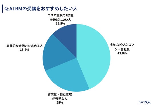 実際にATRMを受講した方からのアンケート結果を分析すると、ATRMをおすすめしたい対象として「多忙なビジネスマン・会社員(43.8%)」と「習慣化・自己管理が苦手な人(25%)」が上位を占めていました。