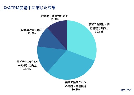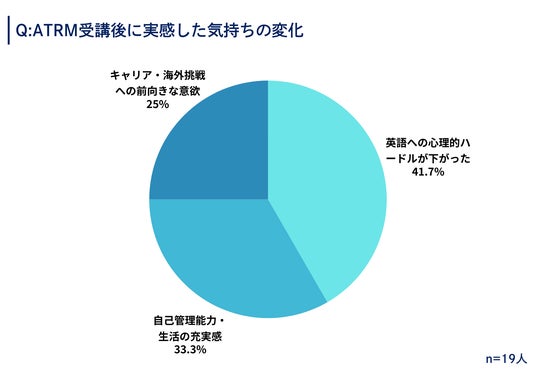ATRMの受講後の変化として「英語への心理的ハードル低下(41.7%)」が最多ですが、注目すべきは「自己管理能力・生活の充実感(33.3%)」という、語学の枠を超えた成果かもしれません。