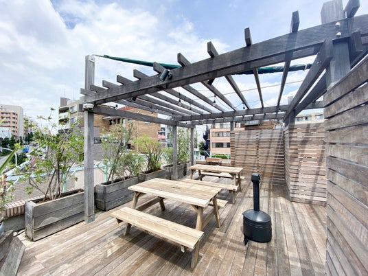 RF(ROOFTOP HANGOUT): 開放的なウッドデッキで、青空の下での打ち合わせやリフレッシュが可能。(9:00~16:00頃まで。雨天時は閉鎖しております)