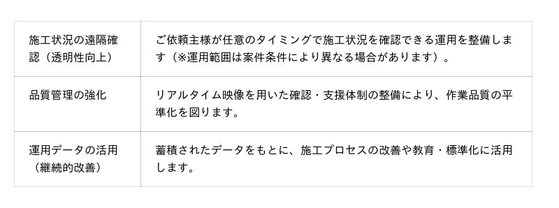 今後も施工プロセスの透明性向上、品質管理の高度化、安全管理体制の強化を軸に、現場DXを積極的に推進してまいります。