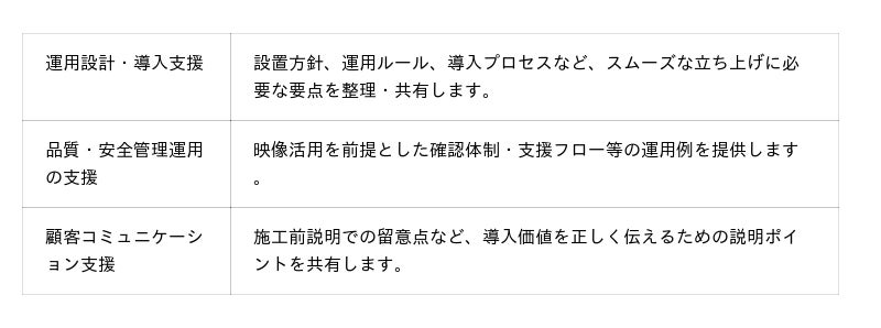 ※導入時の初期レクチャー(オンライン)は、当社が定める範囲において原則無償で提供します。提供条件(内容・回数・時間・期間等)は契約内容および当社の運用方針により変更または終了する場合があり、支援範囲によっては別途費用が発生する場合があります。