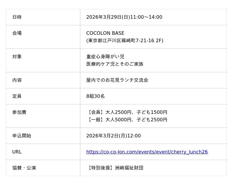 特定非営利活動法人EPO(東京都江戸川区/理事長 齋藤えりか)は、重症心身障がい児と家族・きょうだい・支援者みんなのコミュニティ「COCOLON」において、2026年3月29日(日)、東京都江戸川区のCOCOLON BASEにて「インドアお花見」を開催いたします。