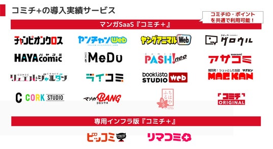 秋田書店「チャンピオンクロス」「ヤンチャンWeb」、白泉社「ヤングアニマルWeb」、早川書房「ハヤコミ」、小学館「ビッコミ」(専用インフラ版) 、集英社「リマコミ+」(専用インフラ版)など、出版社のWebマンガ誌のインフラを担っています。