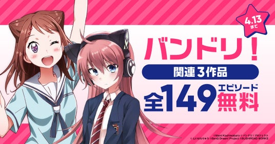 【バンドリ!関連3作品 4月13日まで全149エピソード無料】 コミック版 BanG Dream! (漫画:柏原麻実/原作:ブシロード/ストーリー原案:中村 航) バンドリ! ガールズバンドパーティ! イベントダイアリー (漫画:黒渕かしこ/原作:Craft Egg/ブシロード) RAiSe! The story of my music (漫画:しいはらりゅう/原案:ブシロード/ストーリー原案:中村 航)