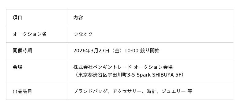 株式会社カイトル(本社:東京都中央区、代表取締役:森本 拓也、松枝 恭平、以下「当社」)は、株式会社ペンギントレード(本社:東京都渋谷区、代表取締役:佐藤 佑一)と業務提携し、中古ブランドオークション「つなオク」を2026年3月より共同開催することを決定いたしました。