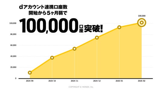マネックス証券株式会社(本社:東京都港区、取締役社長執行役員:清明祐子、以下「マネックス証券」)は、マネックス証券の証券総合取引口座と株式会社 NTT ドコモ(本社:東京都千代田区、代表取締役社長:前田義晃、以下「ドコモ」)が提供する「dアカウント(R)」を連携した口座数が、連携サービス開始後5ヶ月弱で10万口座を突破したことを、お知らせいたします。