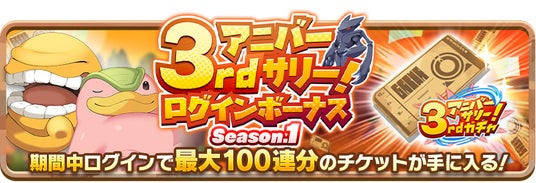 10日間ログインで最大100枚の「3rdアニバーサリーチケット」獲得できるログインボーナスを開催します。チケットは「3rdアニバーサリーガチャ」で使うことができます。