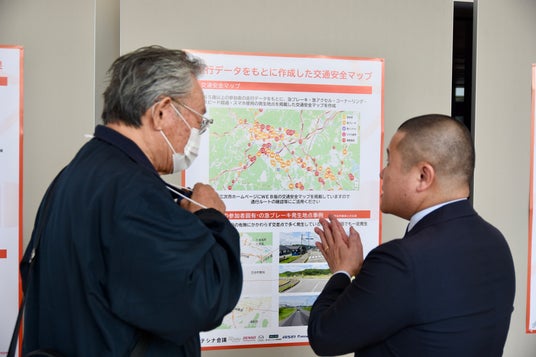 具体的な活動成果として、2024年度に引き続き、車の挙動を測定する車載器である「ADテレマティクスタグ※3」により収集した走行データをもとに、市内の高齢ドライバーの運転特性や、地域の交通危険ポイントを示す「交通安全マップ」を更新しました。その上で、2025年度の新規取り組みとして、ドライブレコーダー映像とAI解析技術を活用した「ドラみる※4」で収集した実際の走行映像により、急ブレーキのような事故リスクが発生している場所や場面を紹介し、リスクを回避するためのポイントを整理し伝えました。加えて、声により日々の心身の状態を測定する「音声バイオマーカー※5」による分析結果を紹介し、運転とドライバーの心身の状態との密接性を示しました。