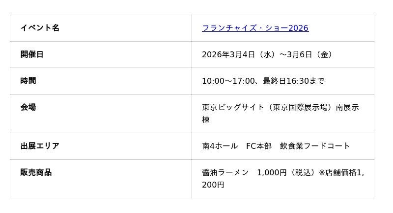 あわせて、同日開幕の「フランチャイズ・ショー2026」に出展し、看板商品「醤油ラーメン」の実食販売とともにフランチャイズビジネスの詳細をご紹介します。