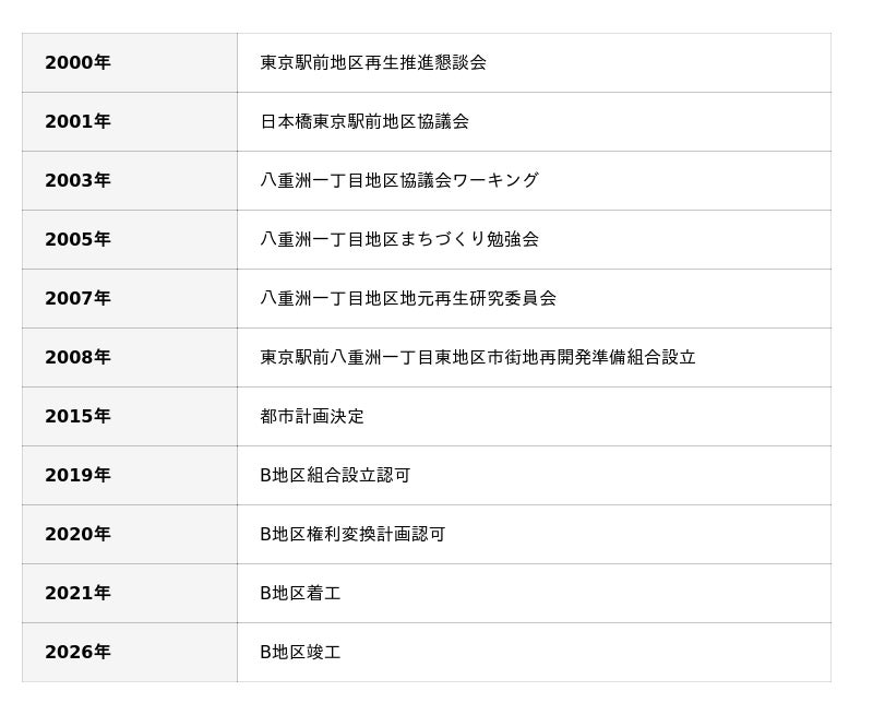 さまざまな勉強会や協議会を経て、2015年に国家戦略特区法に基づき都市計画決定がなされ、2019年に東京駅前八重洲一丁目東B地区市街地再開発組合設立認可、TOFROM YAESU TOWERについて2021年10月1日に新築工事を着工、権利者の皆様の思いを一つに束ね2026年2月28日に竣工を迎えました。