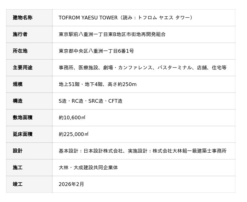 東京建物株式会社が、再開発組合の一員として参画し、東京駅前八重洲一丁目東B地区市街地再開発組合が推進する「TOFROM YAESU TOWER(トフロム ヤエス タワー)」(東京駅前八重洲一丁目東B地区第一種市街地再開発事業、以下「本事業」)が2026年2月28日に竣工したことをお知らせします。