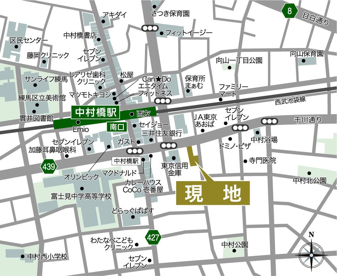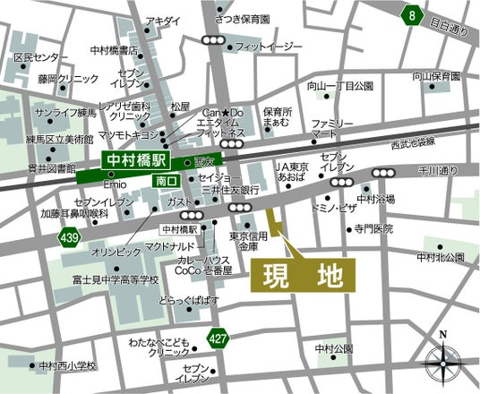 本計画地は、西武池袋線「中村橋」駅徒歩3分、池袋駅や新宿三丁目駅、渋谷駅や横浜駅にもダイレクトでアクセス可能な交通利便性の高い場所です。計画地周辺は商店街やスーパーのほかに、美術館・図書館といった文化施設もあるなど住環境に優れ、様々な生活スタイルに合わせてお住まいいただけます。