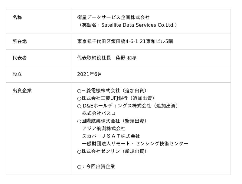 国際航業株式会社(本社:東京都新宿区、代表取締役社長:藤原 協、以下:国際航業)、三菱電機株式会社(本社:東京都千代田区、執行役社長:漆間 啓、以下:三菱電機)、株式会社三菱UFJ銀行(本社:東京都千代田区、取締役頭取執行役員:半沢 淳一、以下:三菱UFJ銀行)、ID&Eホールディングス株式会社(本社:東京都千代田区、代表取締役社長:新屋 浩明、以下 ID&Eホールディングス)、株式会社ゼンリン(本社:福岡県北九州市、代表取締役社長:竹川 道郎、以下:ゼンリン)の5社は、2月27日に衛星データサービス企画株式会社(本社:東京都千代田区、代表取締役社長:粂野 和孝、以下:SDS)へ出資しました※1。それに伴い、SDSは事業会社化し、「衛星データサービス株式会社」として、4月から始動予定です。