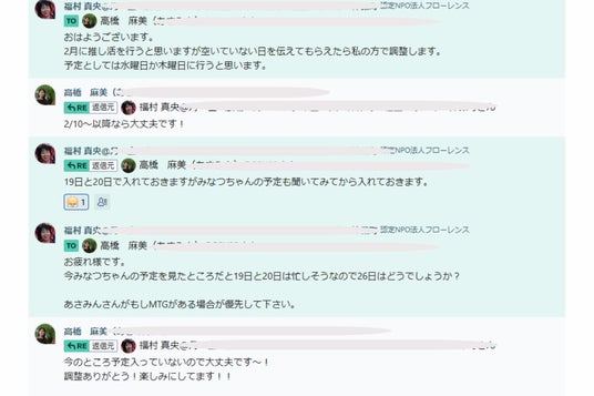 フローレンスでは、社内の業務用チャットとして「Chatwork」を導入しています。この「Chatwork」では、業務外の話や趣味の話でスタッフが個人的にグループチャットをつくってもOK!というルールがあります。アイドルが好き、サッカーが好き、こどもの教育相談、「西武線沿線住人」のグループまで出現し、盛んなコミュニケーションが交わされています。このグループチャットにも当然オペレーションズメンバーが任意で入っていて、ランチタイムや休憩時間にはプライベートな会話で盛り上がってます。