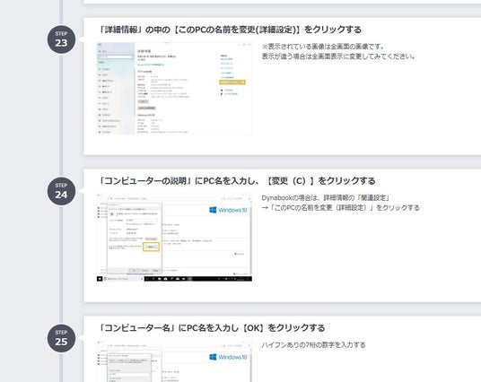 これはパソコン貸与時のセットアップマニュアル。出てくるブラウザのどこをクリックするのかがすぐにわかります。