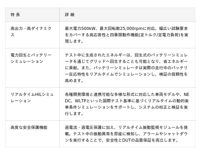 この共同体制により、高額な設備投資が難しいお客様にも「ダイナモメータパワーHILテストシステム Model 1210」を用いた電気駆動システムの信頼性・耐久性テスト、効率テスト、温度上昇テストなど、専門性の高い各種評価試験をご利用いただけます。