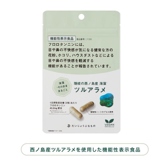 近年、ツルアラメに含まれるポリフェノールの一種「フロロタンニン」には、花粉・ハウスダストなどによる目や鼻の不快感を軽減する機能が報告されており、機能性表示食品(届出番号:J1380)として届け出が受理されています。