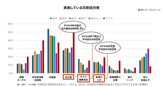当社が実施した調査によると花粉症の自覚症状がある子ども世代では、医療を含む対策の割合が高いことがわかりました。子ども世代は、他世代と比較して花粉症対策の実施率が高く、処方薬の利用が広く浸透していることがわかりました。子どもの花粉症は「放置しない」傾向が強く、保護者の危機意識の高さも背景にあると考えられます。