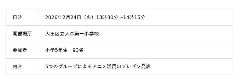 この授業は大田区が独自で推進する教科「おおたの未来づくり」とコラボして行われました。このプロジェクトは、思考ツールなどをつかって、小学生が地域課題を活用するプログラムで、今回は「大田区の会社が作ったアニメーションを使って、どう地域を盛り上げるか?」ということをテーマに、複数回の授業やプレゼンを経て、発表となりました。大田区の教育プログラムについては、下記サイトをご参照ください。