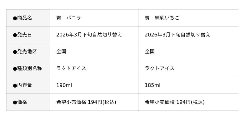 株式会社ロッテは3月下旬から、微細氷入りでシャリッとした食感とさっぱりとした後味が楽しめる「爽」ブランドから、『爽 バニラ』と『爽 練乳いちご』をリフレッシュします。