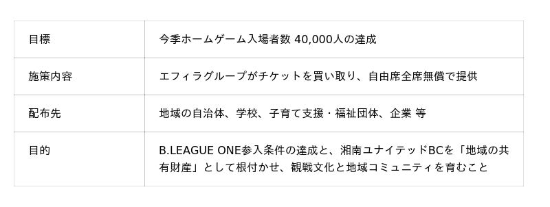 湘南ユナイテッドBCは現在、上位リーグ「B.LEAGUE ONE」への参入条件となるHOME GAMEの入場者数4万人の達成に向け、昨年秋より経営に参画したエフィラグループの主導のもと、クラブ一体となって大規模な入場促進施策「4万人プロジェクト」を推進しています。