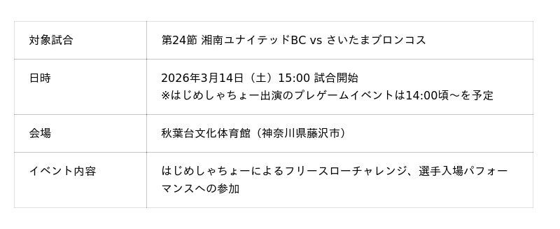 プロバスケットボールクラブ「湘南ユナイテッドBC」(B3リーグ所属、運営:株式会社湘南ユナイテッド藤沢)は、新リーグ「B.LEAGUE ONE」参入条件である年間入場者数4万人達成に向けた「4万人プロジェクト」の最終章を飾る大一番として、2026年3月14日(土)に秋葉台文化体育館で開催されるホームゲーム(さいたまブロンコス戦)に、日本を代表する動画クリエイター・はじめしゃちょーを特別ゲストとして招待いたします。