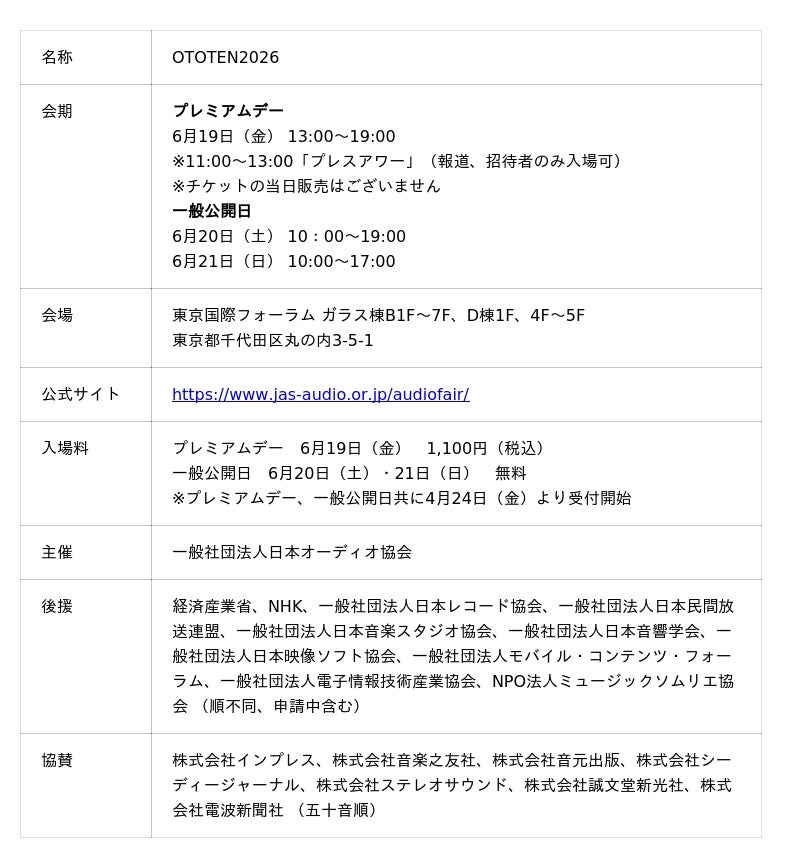 一般社団法人日本オーディオ協会(所在地:東京都港区、会長:小川理子)は、オーディオの総合イベント「OTOTEN2026」を2026年6月19日(金)~21日(日)の3日間、東京国際フォーラムにて開催いたします。2026年は会期を3日間に拡大し、一般公開日に先がけて、入場者数を限定した「プレミアムデー」を新設します。