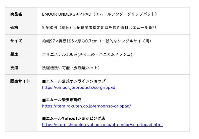 「身体に合った寝る・座る・たたむ」を提供する健康家具ブランドEMOORを展開する株式会社エムール(東京都立川市:代表取締役 高橋 幸司/以下エムール)は、2026年3月4日よりマットレスの下に敷くことで「ずれる、蒸れる問題」を軽減する『EMOOR UNDERGRIP PAD(エムールアンダーグリップパッド)(以下、アンダーグリップパッド)』の販売を開始しました。