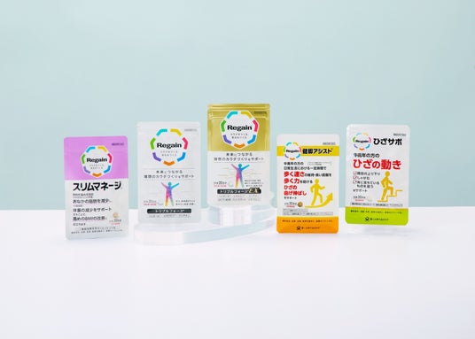 1988年に誕生した「Regain」は、「再び元気になる」というコンセプトのもと、バブル全盛期「24時間戦えますか。」のキャッチコピーでドリンク剤を発売してきました。時代の変化とともに、「再び元気になる」というコンセプトはそのままに、「カラダをつくる、明日をつくる」のキャッチコピーで人生100年時代に寄り添うブランドとして、ドリンク剤だけではない様々な商品をご提供しています。