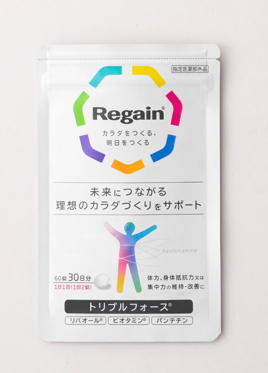 「24時間戦えますか。」のキャッチコピーで親しまれたドリンク剤の「リゲイン(R)」は、ここ一番というときに元気に頑張る人を応援してきました。「リゲイントリプルフォース(R)」は毎日続けやすい錠剤という形に生まれ変わり、疲れにくいカラダづくりをサポート。いつまでも若々しく、毎日を元気に、人生を楽しみたいと願う方々を応援します。