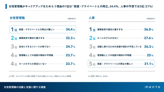 マネジメントサクセスプラットフォーム「mento」を提供する株式会社mento(本社:東京都港区、代表取締役:木村憲仁、以下mento)は、100名以上の企業に勤める女性管理職(課長以上、300名)および人事担当者(300名)を対象に「女性管理職の活躍と支援に関する調査」を実施いたしました。